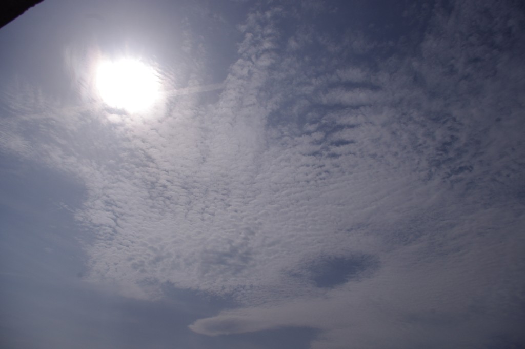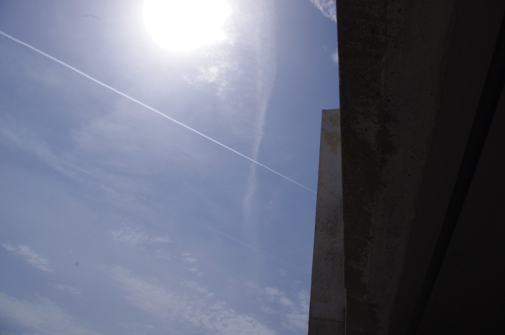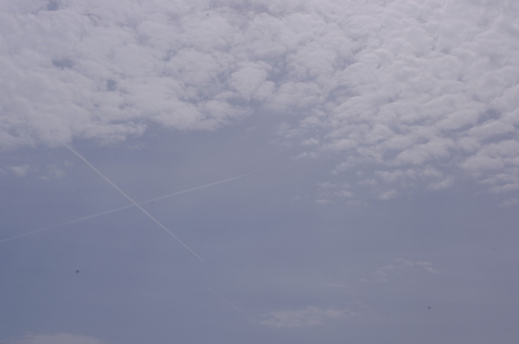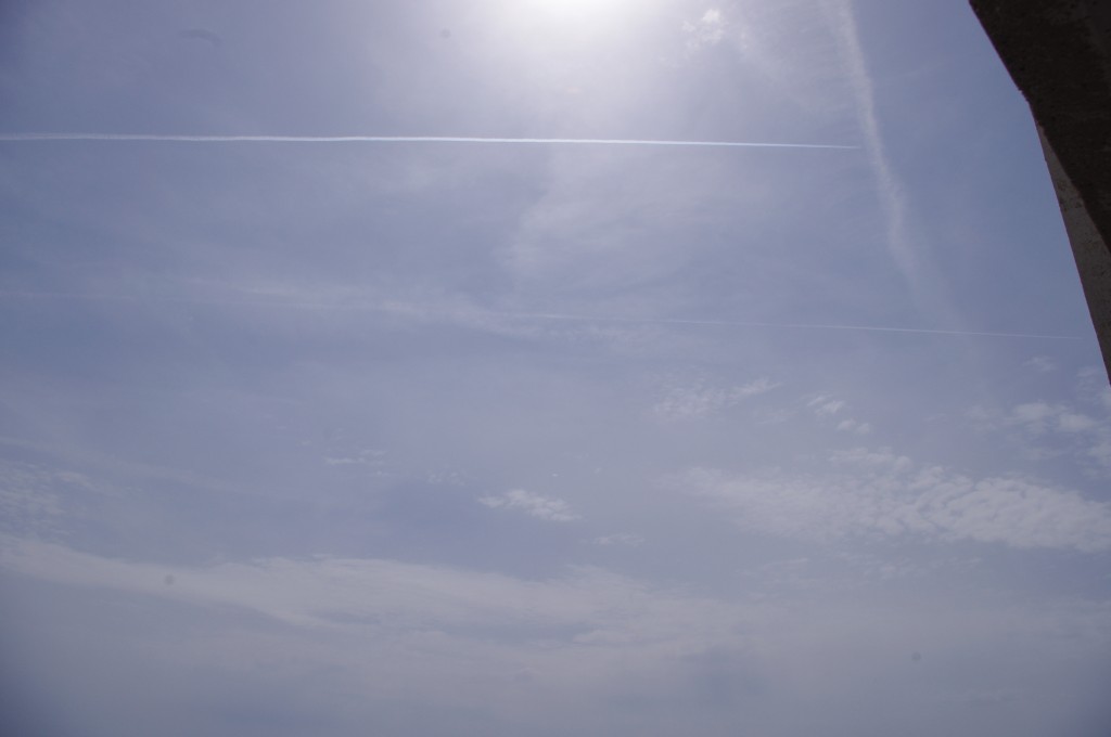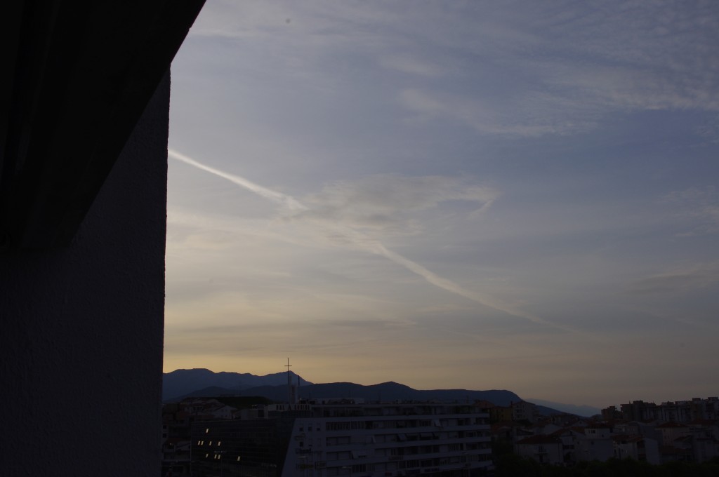 Prve tri slike su oko 6.30 ujutro snimane. Kao što se vidi zaprašivači rano počinju svoje ture, dapače, pitanje jeli uopće staju preko noći. Ostale snimke su nastale negdje oko 9-10sati, a zadnjih 8 oko 14-15h.Čak i u ovih par navrata što sam bezveze slikao nebo s kamerom, uhvatio sam stvaranje križa, probijanje procijepa po umjetnim oblacima (dark beam), te linijsko zaprašivanje ispod sunca koje zaprašivaćima očigledno najviše smeta.