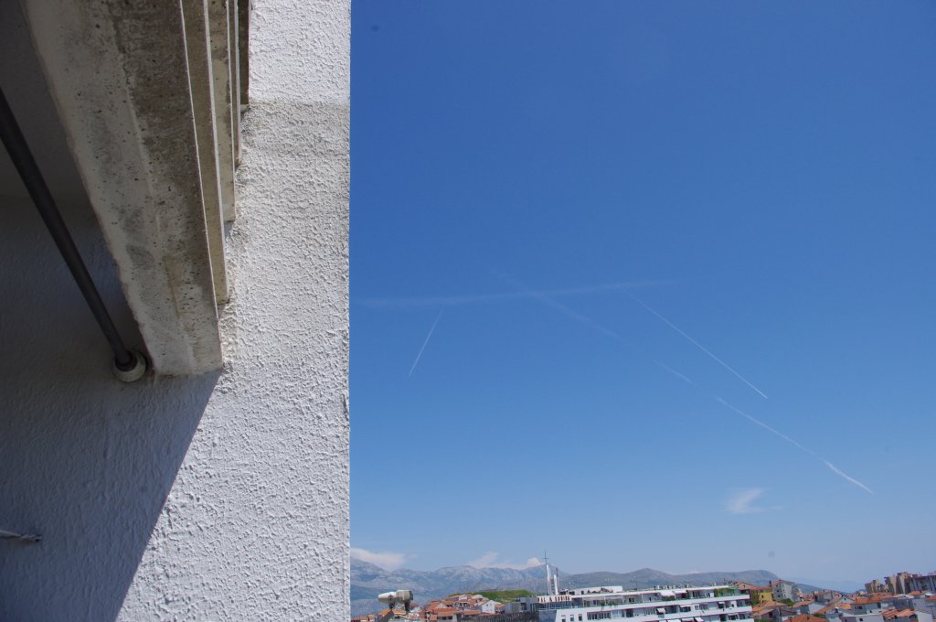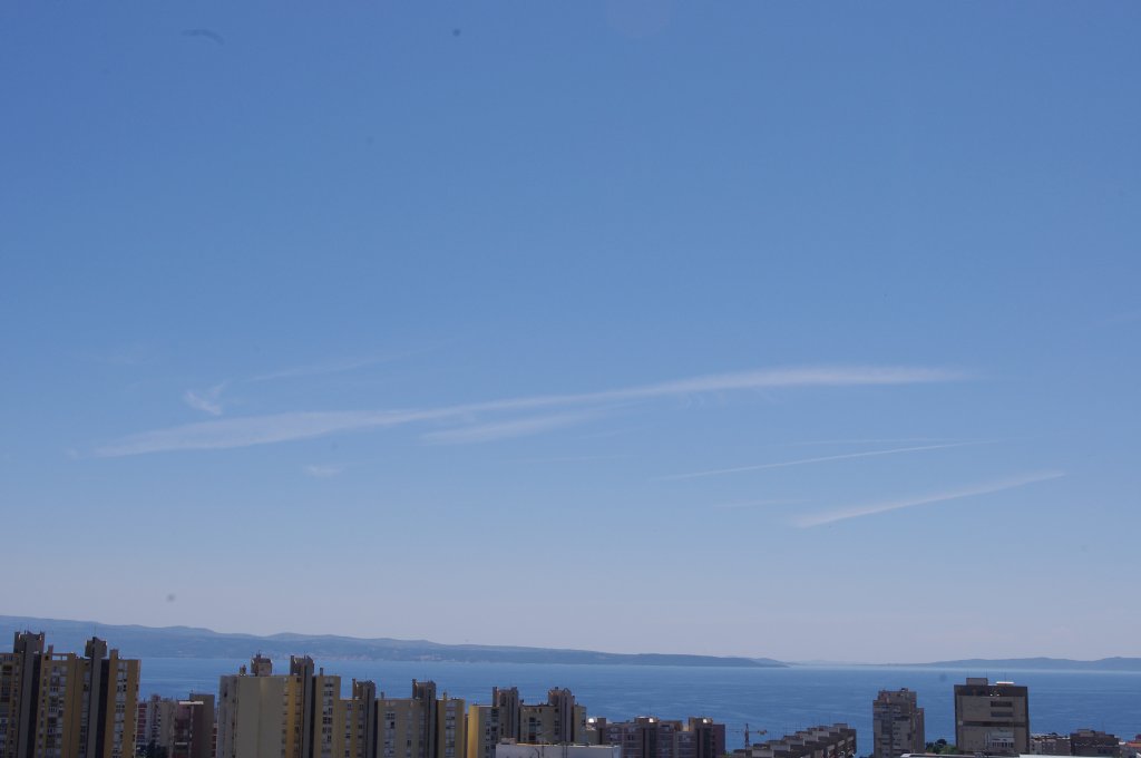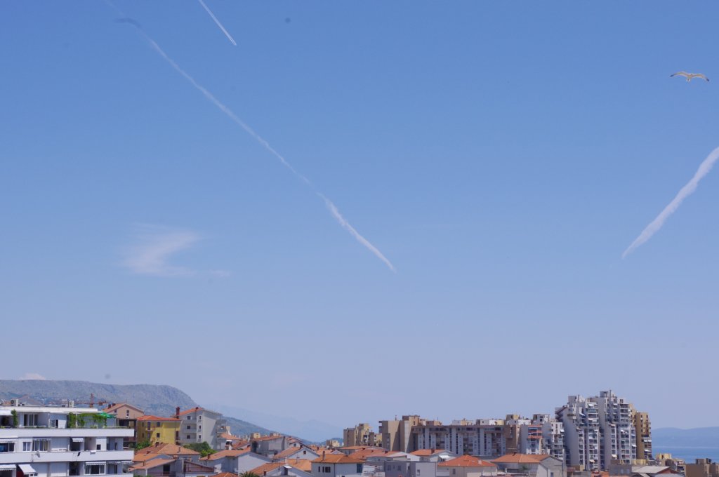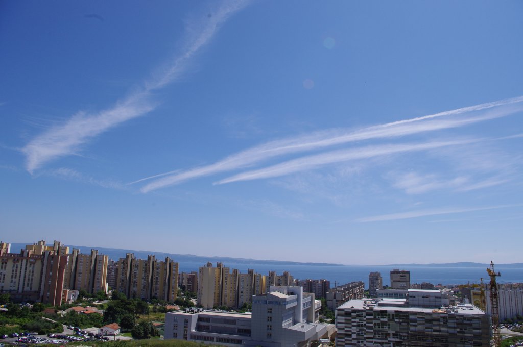 Smjer: W->E. Vrijeme: 17.30h. Evo prvi od dva bio-kemijska zaprašivaća. Na slikama se jasno uočava trag iz repa aviona. Međutim, detaljnijom analizom uočavam da trag ne ide iz samog vrha repa već s desne strane blizu repa. Ovo može biti optička varka, ali moguće je da osim APU ispuha, postoji joše neki otvor kroz koji se ispuštaju otrovi. Podsjećam: trag iz repa aviona ne bi smio postojati jer APU jedinica (rezervni generator) ne radi za vrijeme leta (osim u slučajevima nužde). Kako god bilo, ovo je 100% dokaz da avion ispušta sumnjive materijale, a trag iz motora neću ni spominjati jer se na prvoj slici jasno vidi kako ostavlja dugi i perzistentni trag kada se našao među oblacima. Kad je došao iznad grada, onda se prebacio na kratki kemijski trag, ali je zato upalio bio-kemijski ispuh na repu aviona. Očigledno da je stanovnike grada Splita potrebno dobro posprejati 'lijekovima', pesticidima, otrovima, parazitima i ko zna čime sve ne, da se ne bi previše bunili nego samo: posao, kuća, posao, kuća, posao, kuća...