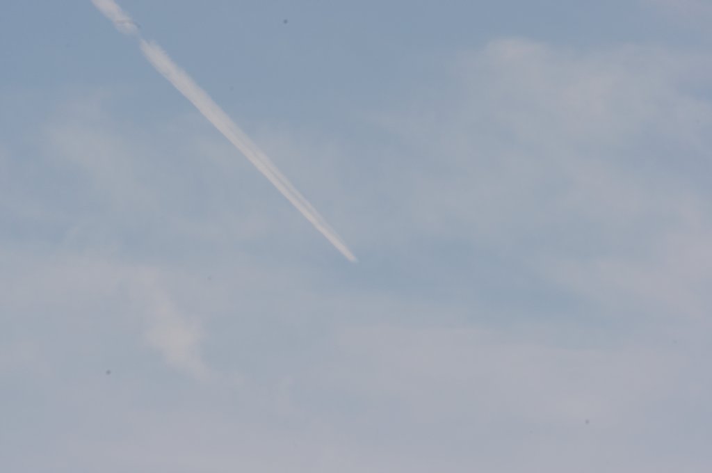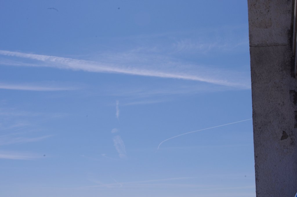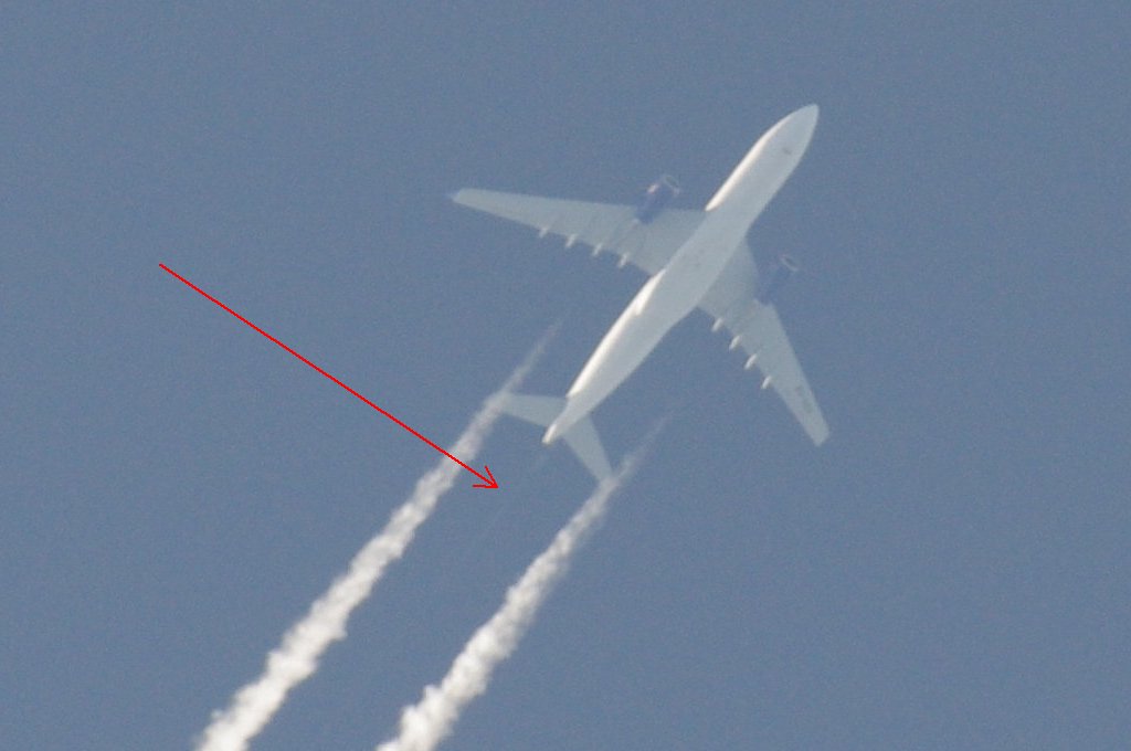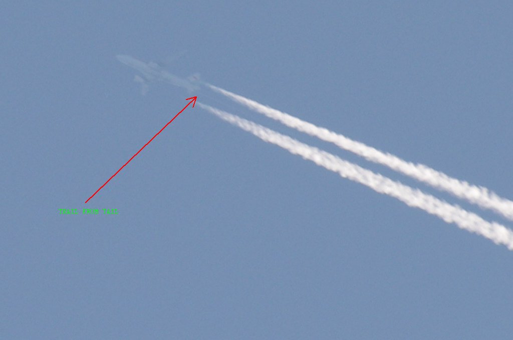 Ovo je na prvi pogled bio rutinski dan, ali kasnijom analizom slika uočio sam kako DVA aviona iza sebe ostavljaju tanki trag iz repa. Dok se za trag iz motora još može diskutirati jeli contrail (kondenzacijski trag) ili chemtrail (kemijski trag), za trag iz repa aviona NEMA sumnje da se radi o chemtrail-u. Dapače ja zastupam tezu da je trag iz repa aviona odnosno iz tzv. APU jedinice uglavnom biološkog podrijetla usmjeren protiv ljudi i bio-svijeta (paraziti, bakterije i ostala gamad) jer je ispuh APU jedinice relativno daleko od motora pa ispušteni materijal ne mora biti toliko otporan na temperature.