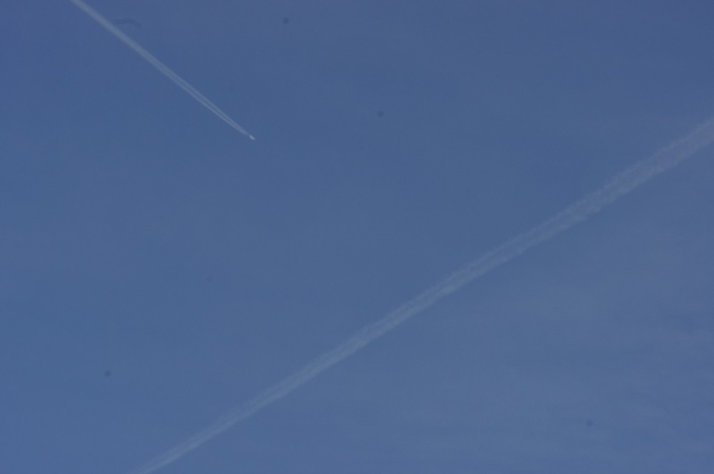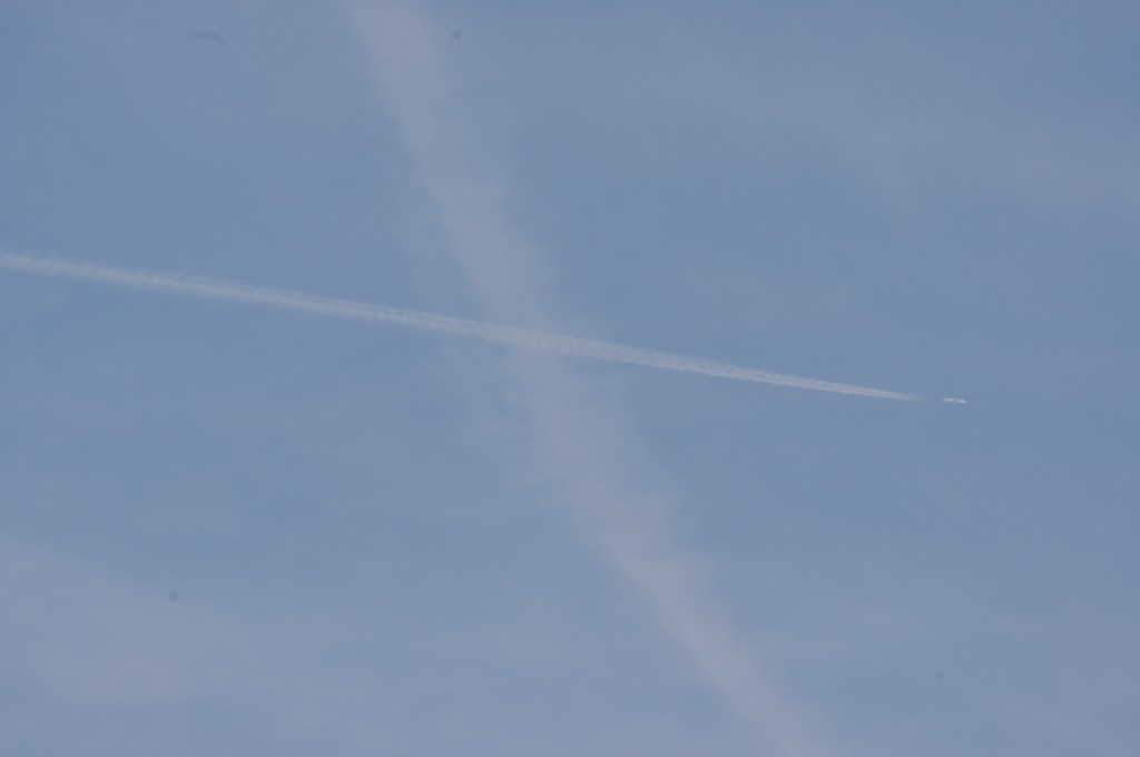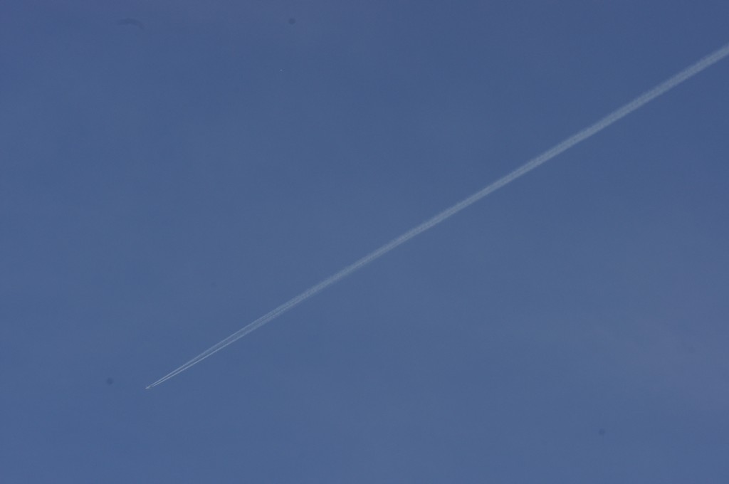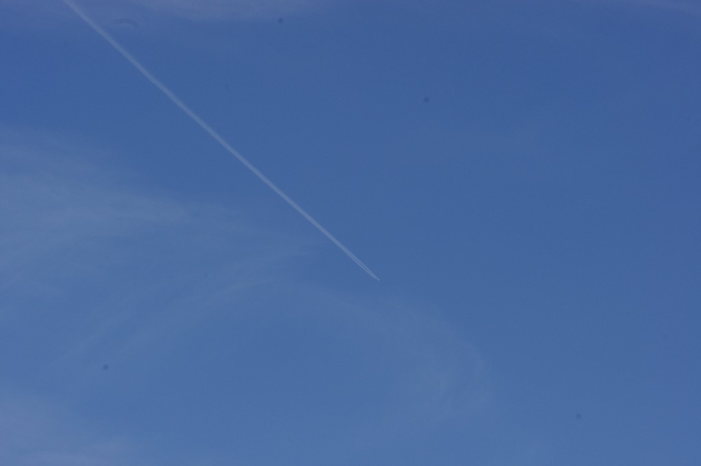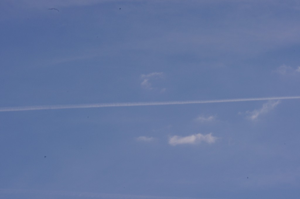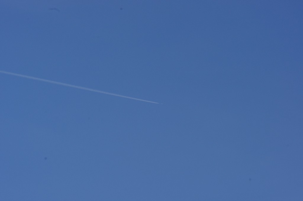 Smjer: N->S. Vrijeme: 10.34h. Opet neidentificiran, šteta jer mi je prošao iznad glave. Opet dugi i perzistentan trag kojega sam uslikao izbliza. Interesantan je model raspršivanja traga, vrlo neobičan, po mom skromnom i nestručnom mišljenju, teško da odgovara kondenzacijskom tragu.