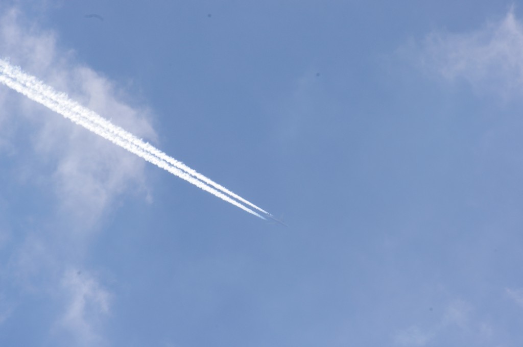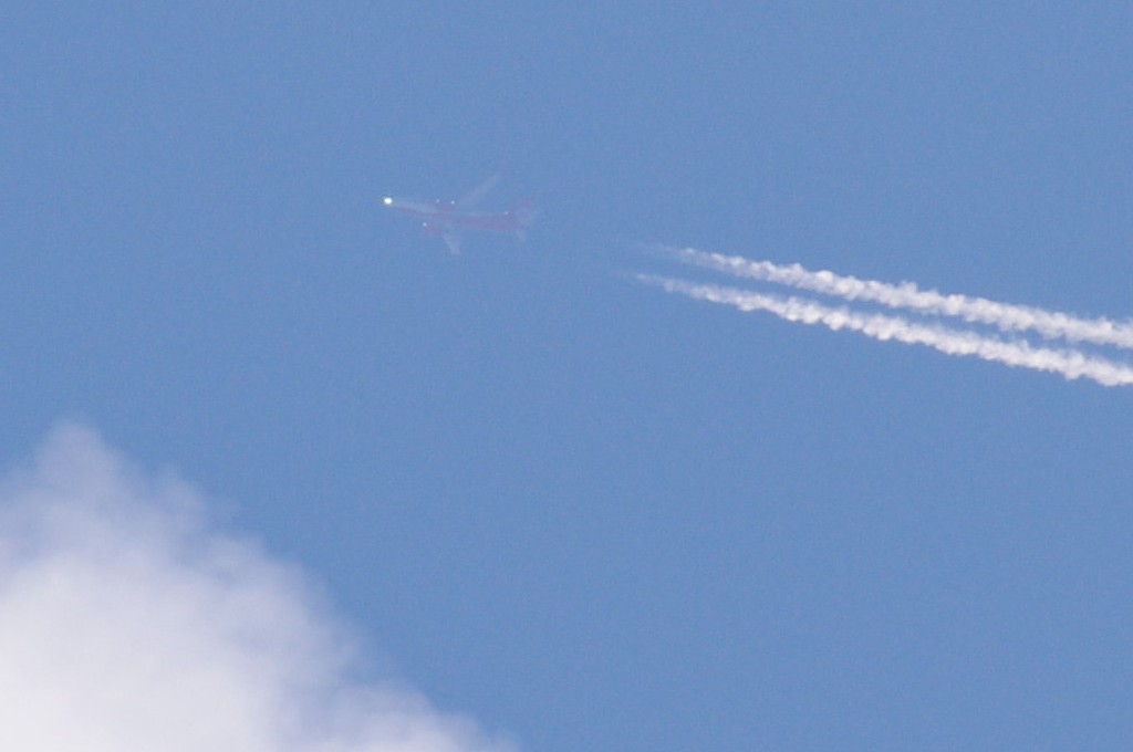 Smjer: N->S. Vrijeme: 10.33h. S obzirom da daljinu, ne mogu ga identificirati, ali najvjerovatnije se radi o putničkom avionu. Zanimljiv je dugi i isprekidani trag koji ostavlja. Da podsjetim, osim u iznimnim situacijama, normalni konedenzacijski trag traje oko 30 dužina aviona i brzo se raspršava, ako se uopće i formira. Ovaj trag je dosta duži i perzistentan.