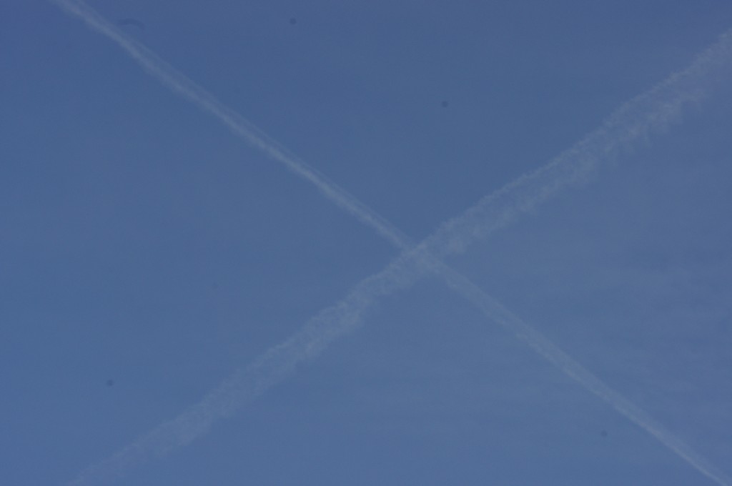 Vrijeme: 14.54h. Dva nepoznata aviona idu u križajući pattern. Prvi avion se križa s starim tragom, zatim s drugim avionom, pa opet s starim tragom. Iskreno rečeno, u ovom trentuku, nebo je išarano tragovima, tako da ih nije ni mogao izbjeći. Opet slikam nekoliko sivih kuglica. ORB-ovi ili nešto drugo, tko zna...