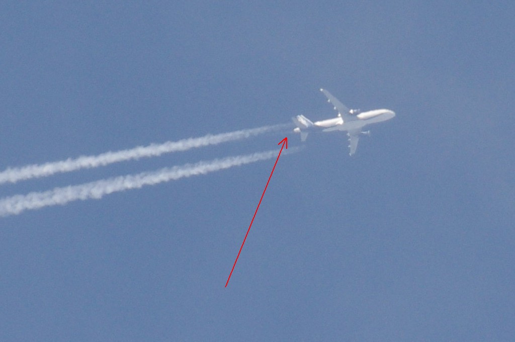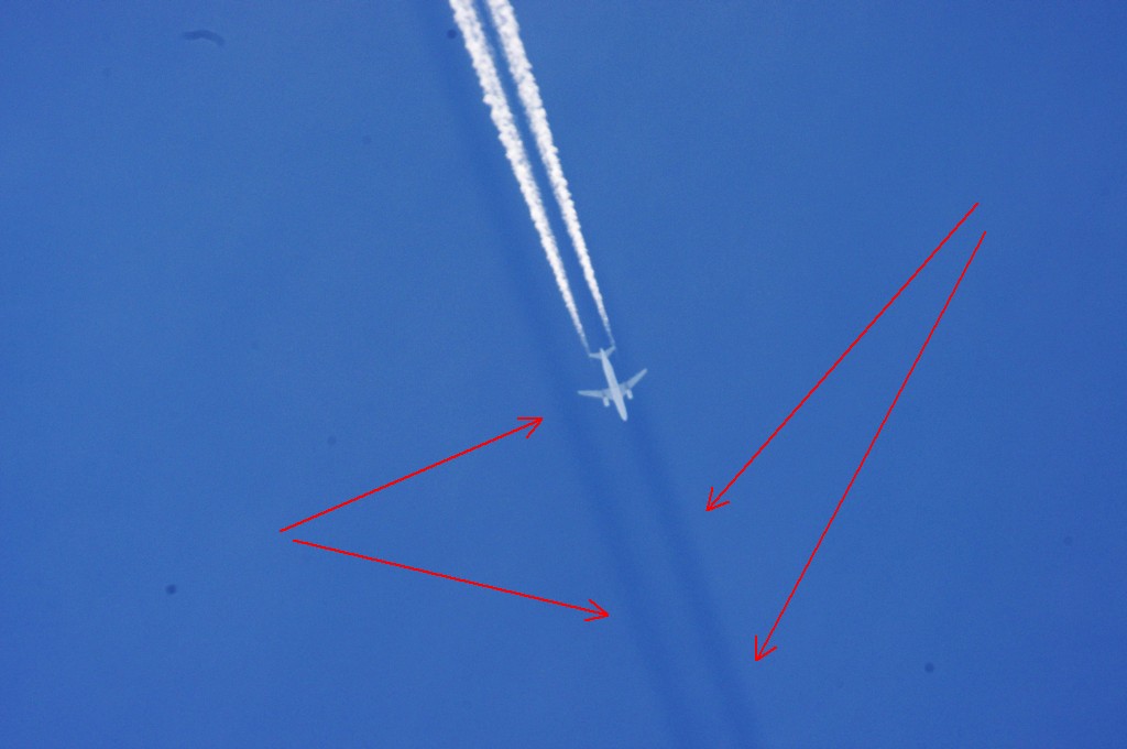 Smjer: NW->SE. Vrijeme: 10.57h. Neidentificiran, ima motore na repu, pa može biti Yak, Tupovljev ili McDouglas, ali to je nebitno. Bitan je model traga: prvo ostavlja relativno dugi perzistentni trag iznad moje zgrade, zatim ništa, pa onda kratki, pa onda onda malo duži, stanka, pa opet malo duži pa stanka. Vrlo zanimljivo. Neko 'logično' obašnjenje bi bilo da je uletio u područje niže temperature ili vlažnosti i da je to učinio točno 4 puta, odnosno da je našao 4 termička džepa s tim malo drukčijim vremenskim prilikama što je uzrokovalu pojavu contraila (kondenzacijskog traga). Ovo 'logično' objašnjenje je u biti jedino objašnjenje koje vam mogu ponuditi stručnjaci. Međutim, ovo je meni nelogično jer: