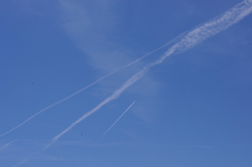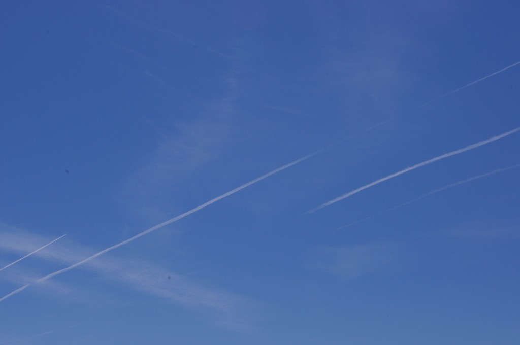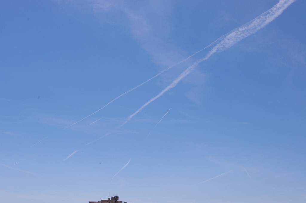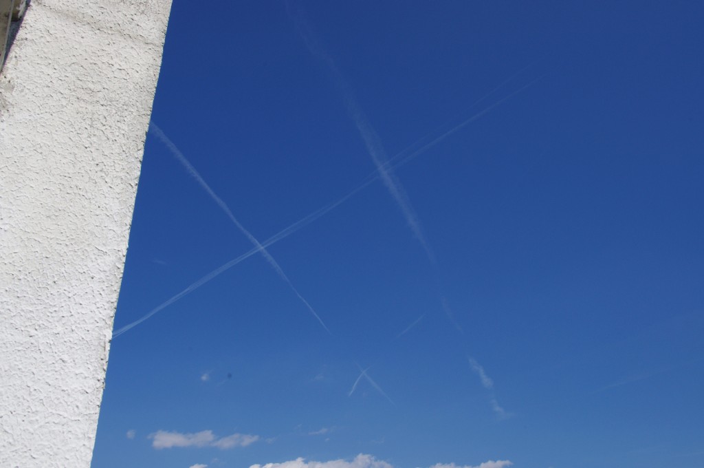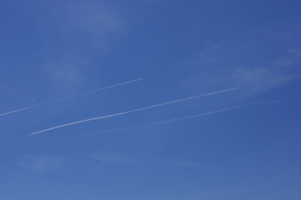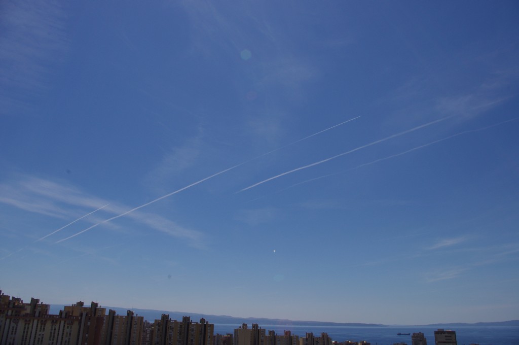 Slike ljetnog neba. Nema više čistog plavog neba. Samo tragovi, tragovi koji idu tko zna gdje. Na slikama sam uhvatio tri i više paralelna traga. Jedan stariji i dva novo stvarajuća. Kao što bi Ilija Čvorović rekao: osnovna udarna diverzantska postrojba je udarna trojka!