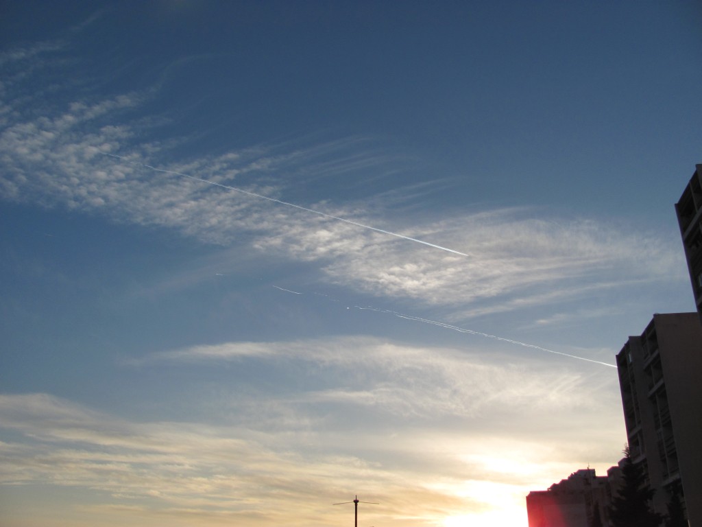 Na nebu su se polako vukli kemijski oblaci raznošeni vjetrom. U jednom trenutku prozujao je avion i ostavio kemijski trag. Dogodilo se to točno u 16.58h. Očigledno je da se radi o kemijskom tragu jer ima oštri početak koji ne odgovara običnom kondenzacijskom tragu. Veoma je dug. Ostao je na nebu skoro sve do mraka, odnosno nekih sat vremena, a možda i više. Tijekom idučih 40 minuta slikao sam taj trag kako se pretvara u oblak. Od 16.58h do 17.39h. Sljedeće slike jasno pokazuju kako se od kemijskog traga aviona formira cirusni kemijski oblak kojega neiskusno oko nikad neće zamijetiti i razlikovati od 'pravih' oblaka.
