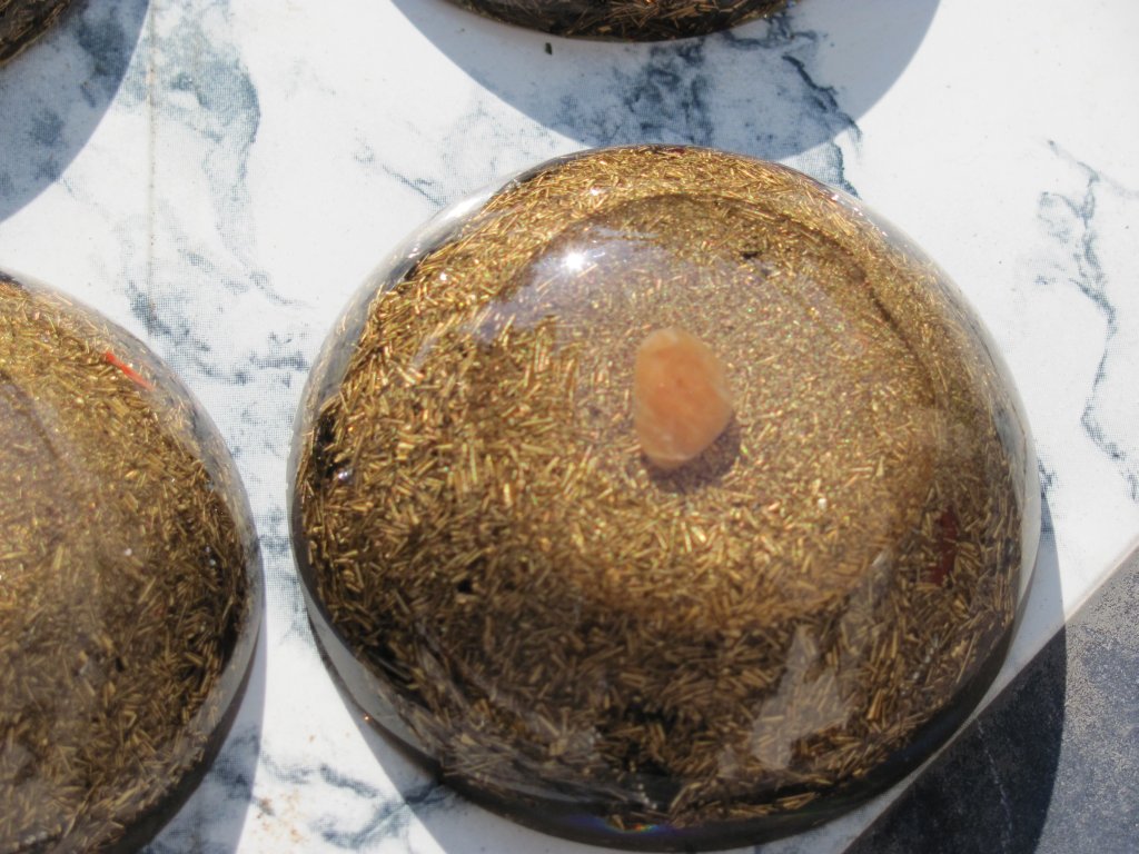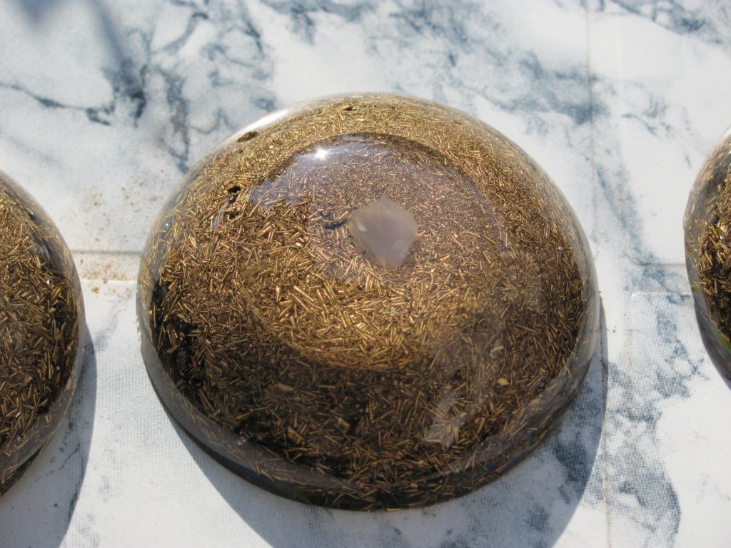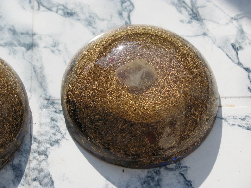 Napomena: medaljoni s kristalom na vrhu se rade iz dva puta: prvi dan se stavi samo malo smole i kristal. Drugi dan kad se stvrdne ovaj dio, nastavlja se izradom ostatka orgonita. Ovdje sam opet pogriješio jer skoro svaki orgonit ima male rupice od mjehurića zraka, znači uvijek se prvo treba naliti tanak sloj smole, a zatim stavljati metal i kristal, nikako ne obrnuto, ako se žele izbjeći ove male rupice, jer bez obzira na utiskivanje i miješanje smjese, uvijek ostanu neki džepovi.