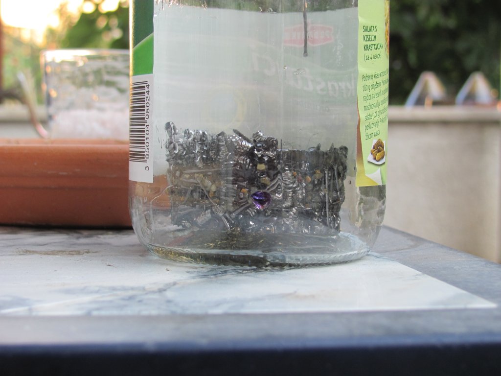 Na vrhovima HHG-a: roza kvarc (bliži, rozasti) i aventurin (dalji, zelenkasti), unutra su špice gorskog namotane s Mobious coil, u dnu su malo veći grumeni gorskog i sitni komadići gorskog kristala i ametista ili roza kvarca, od metala mesing je glavni, ima malo bakra koji je nekim čudom pozelenio, a za malo extra krupnu piljevinu sam stavio i brokve i ostatke spužvice za suđe.