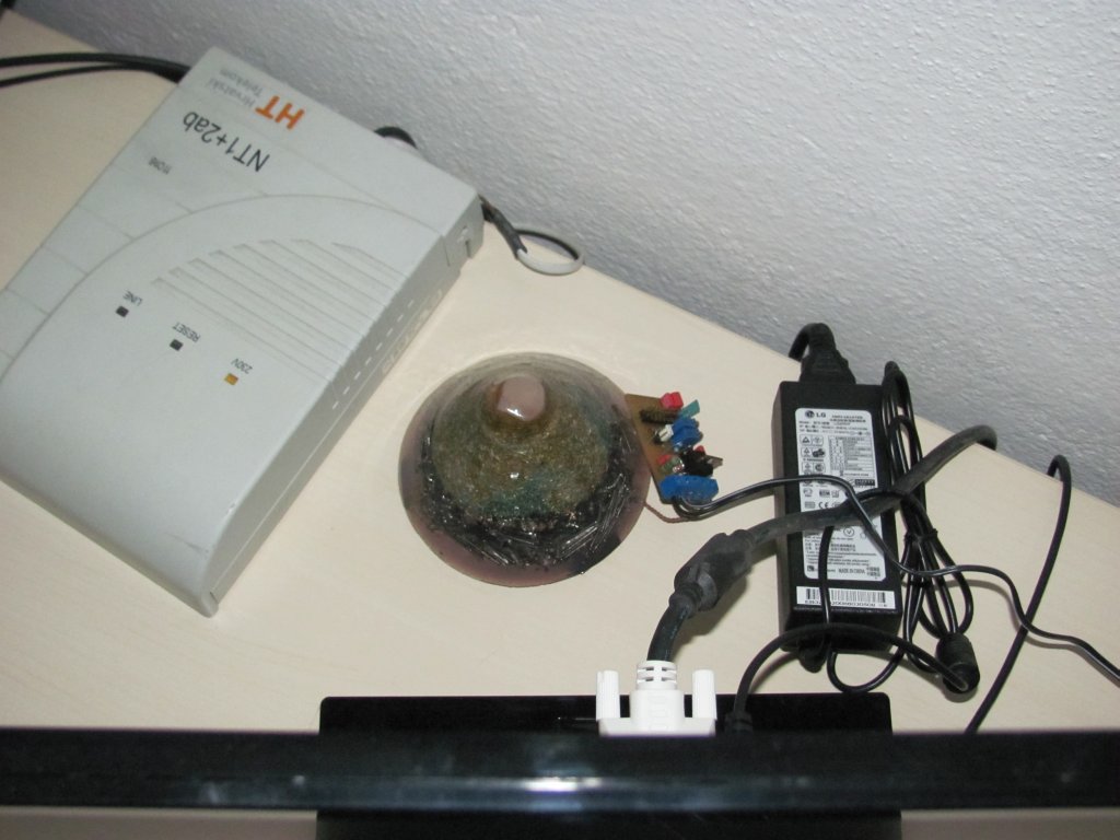 E sada ide konačni 'deploy' novih orgonitnih prinova. Naime, na alternativa forumu sam uočio da ljudi koji se intezivno bave orgonitima i imaju po kući dosta broadcastera ili orgonita s Mobius coilom da te uređaje rijetko pale i spajaju na zapper. S druge strane sam uočio da mobitelski tornjevi i ostali emiteri DOR-a rade 24/7, stoga je moja namjera bila očita: napraviti sustav koji će raditi 24/7. U tu svrhu sam iskoristio jedan akumulator, sklepao zapper i spojio orognit na nj. Međutim, kasnije sam akumulator zamijenio mnogo praktičnijm rješenjem u obliku adaptera.