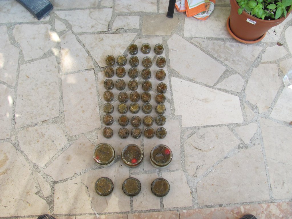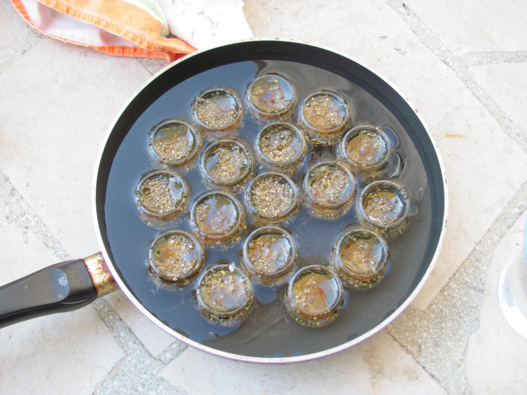 Pošto karamel uvijek bježi na sve stane i lijepi se za tegle, a ne želim ostaviti mravima tragove, a tlaka mi je svaku teglu čistiti izvana od ostataka karamela, sjetio sam se da ih jednostavno potopim u vodu do ruba i tako ih automatski očistim. Eto, praksa znači usavršavanje. Fino je raditi s šečerom, ali šteta što su ipak slabiji i nepostojani ovi orgoniti. Iako sam ih dobro sakrio i zakopao, nakon dosta kiša i sunca, pitam se koliko ih je ostalo funkcionalno. Kad uhvatim vremena morati ću napraviiti inventuru i podnijeti izvještaj, ali sasvim sam siguran da su ovi s čepom bez problema ostali živi, stoga kad pravite šečerne orgonita za giftanje okoliša pobrinite se da: