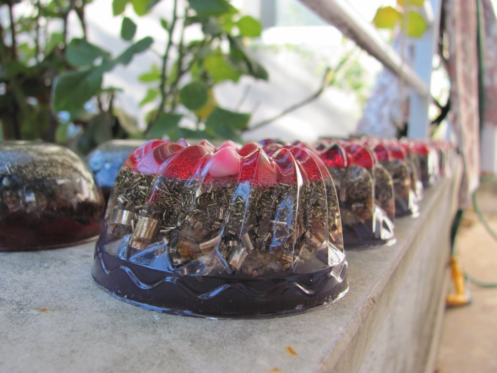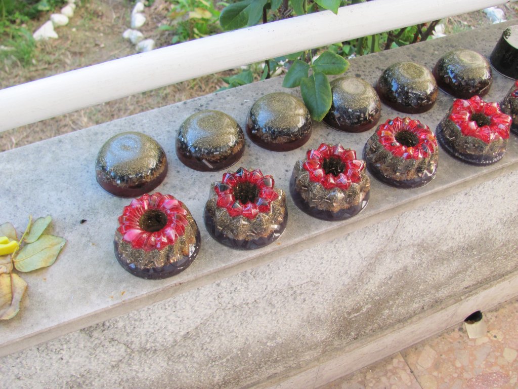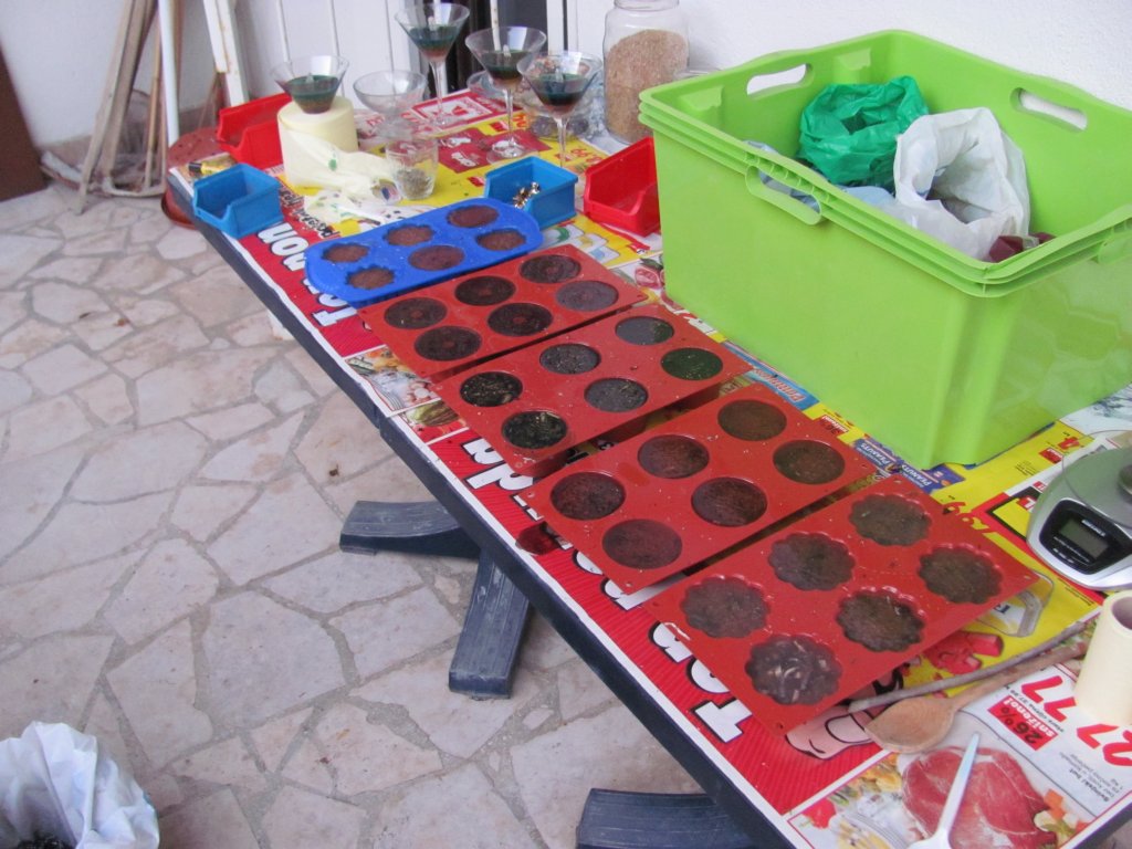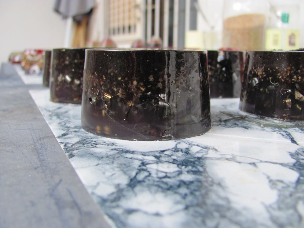 Opet sam pokrenuo sve proizvodne kapacitete i uposlio svih 5 kalupa za TB-ove, te četiri koktel čaše za HHG-ove. Crveni TB-ovi su napravljeni s glazurom od epoksida. Dan prije sam u kalupe ulio tanak sloj epoksidne smole i fino razmjestio kristalčiće, kako je epoksid fino proziran svi kristalići se lijepo vide. Crni TB-ovi su napravljeni od gize u prahu, a inače svi sadržavaju i mesing prah te krupniji metal uz dodatak raznih kristala.