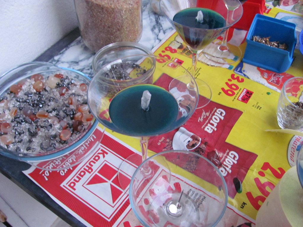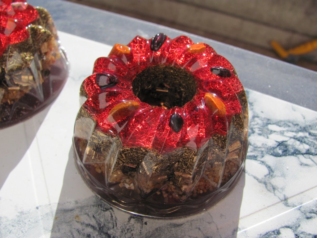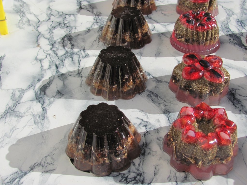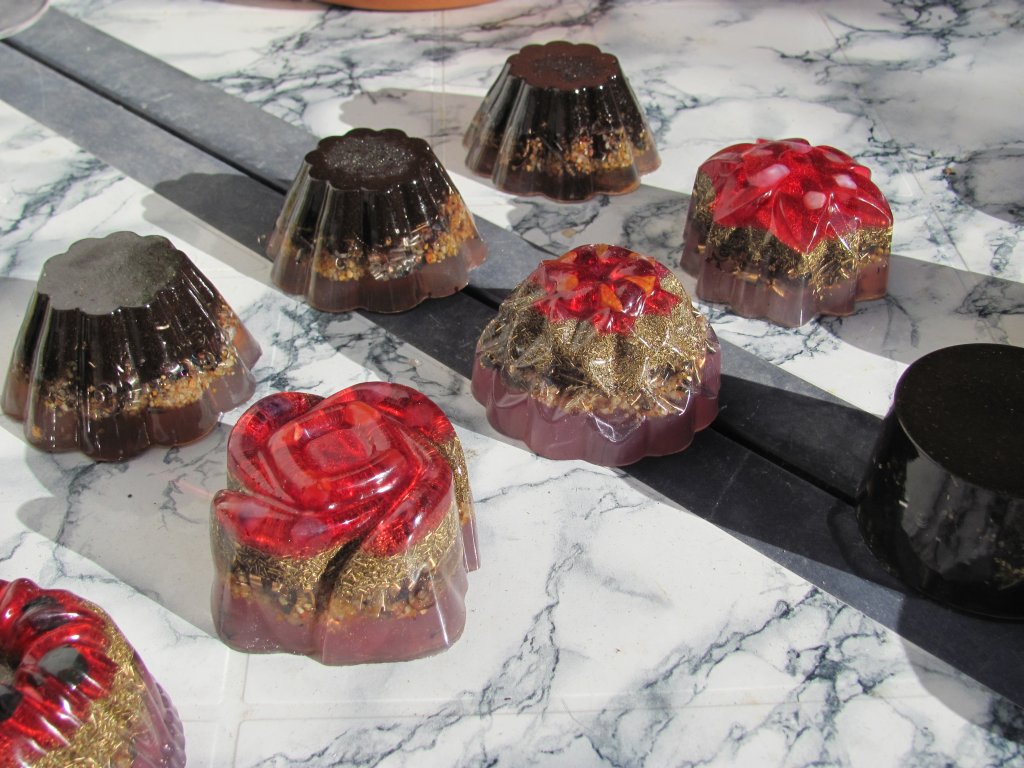 Opet sam pokrenuo sve proizvodne kapacitete i uposlio svih 5 kalupa za TB-ove, te četiri koktel čaše za HHG-ove. Crveni TB-ovi su napravljeni s glazurom od epoksida. Dan prije sam u kalupe ulio tanak sloj epoksidne smole i fino razmjestio kristalčiće, kako je epoksid fino proziran svi kristalići se lijepo vide. Crni TB-ovi su napravljeni od gize u prahu, a inače svi sadržavaju i mesing prah te krupniji metal uz dodatak raznih kristala.