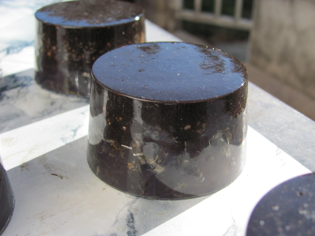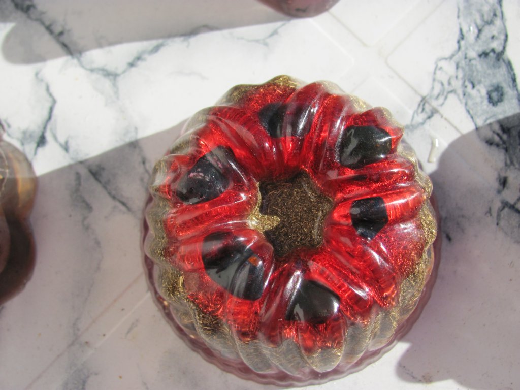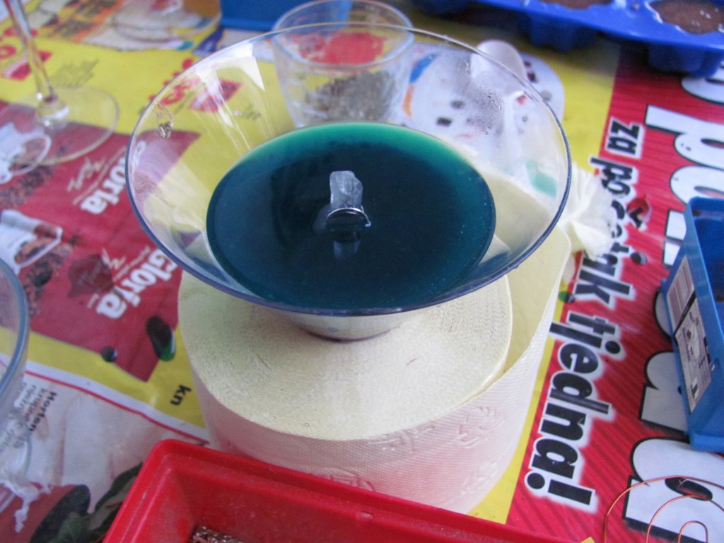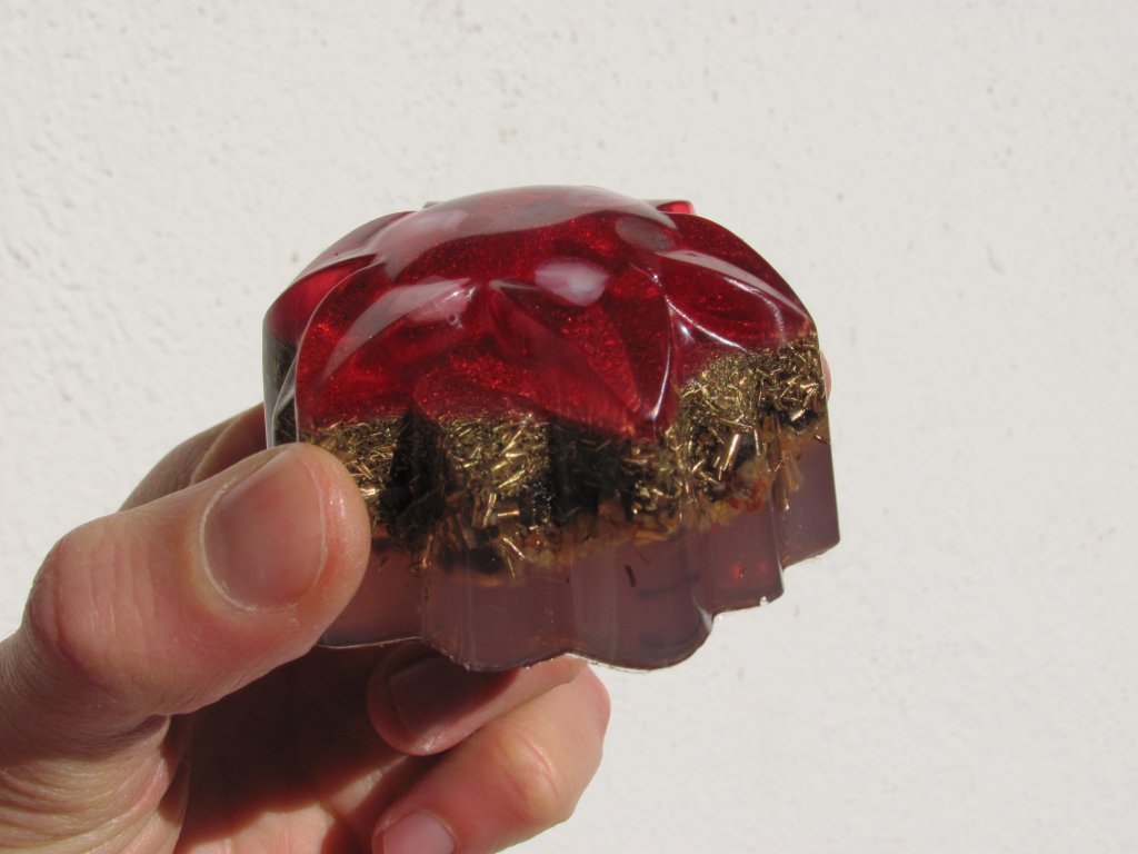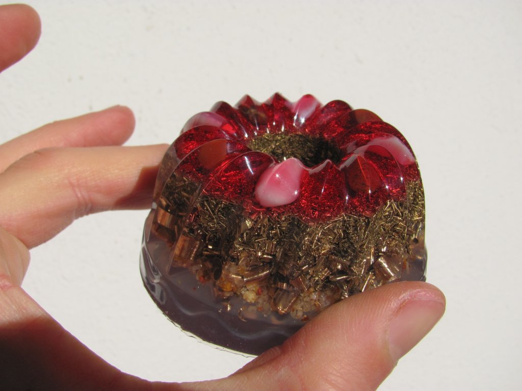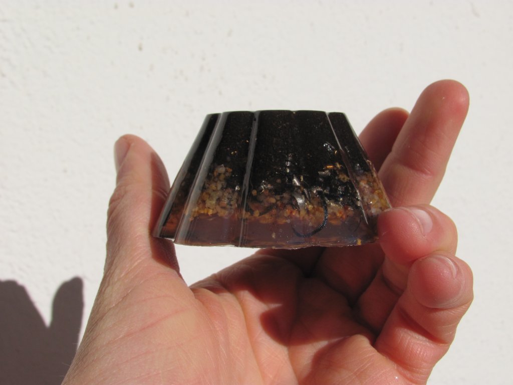 Inače zanimljiva je ova poliesterska smola koju nabavljam u splitskog Kemilaka: kad je neaktivirana onda je plave boje, kad se aktivira onda promijeni boju u zelenkasto-smečkastu, a kad se stvrdne onda postane rozasta. Kao da prolazi kroz cijeli spektar. Savjet orgonit-novacima: kad miješate smolu i aktivator odnosno kad aktivirate smolu, tek kad ona počne mijenjati boju onda znajte da ste dovoljno miješali, prije toga nemojte stati s miješanjem. Ja inače vrtim s kutlačom bar 3-4 minute dok smola ne promijeni boju i dok se pojavi bezbroj malih mjehurića u smjesi, onda znam da je smola sigurno aktivirana.