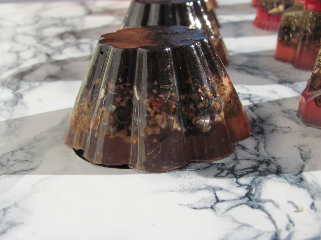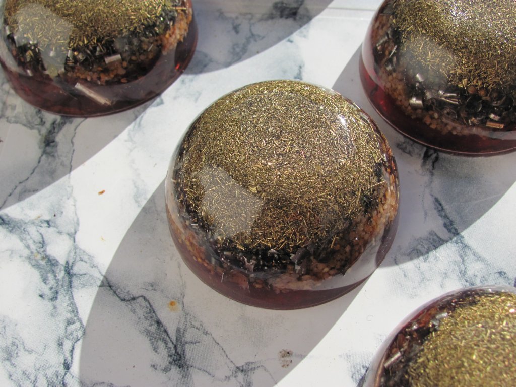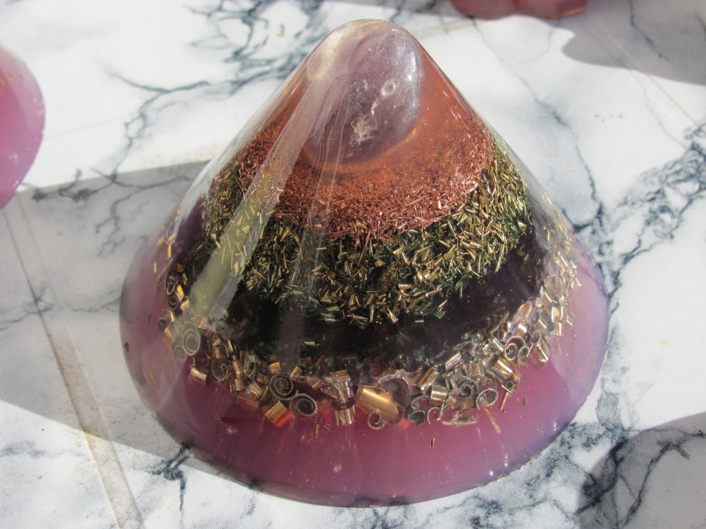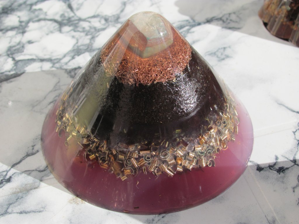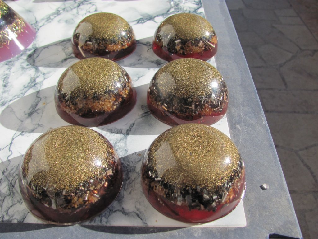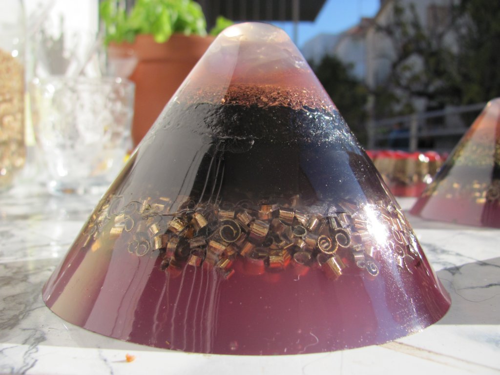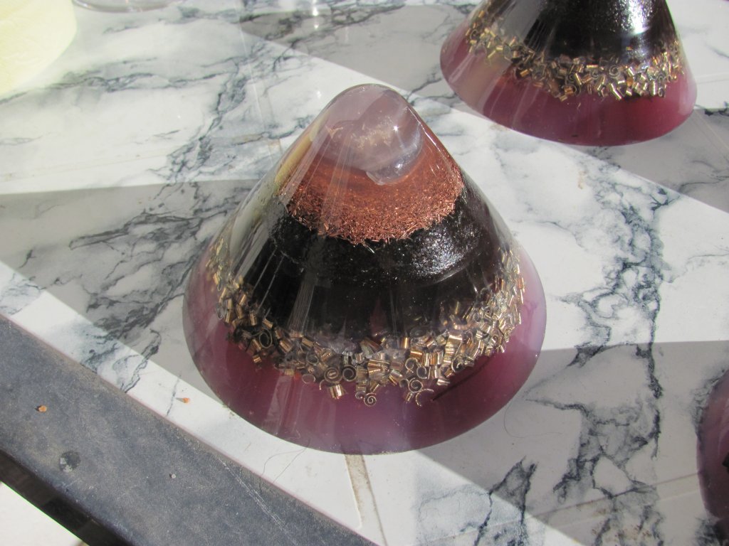 Posebnu pažnju sam posvetio izradi HHG-ova koje sam izradio u više slojeva: prvi sloj je samo kristal i smola. Drugi sloj je bakar i mesing prah ili prah od gize i zatim sam namjerno ostavio 'bufer' zonu čiste smole od 1 cm i utaknuo špice gorskog kristala s zalijepljenim posrebrenim botunima koji daju posebnu vibru srebra energetskom outputu orgona. Drugi dan sam nalio završni sloj s krupnim metalom koji je tako završio na dno HHG-a (kad se okrene) zajedno s obaveznim SSB zavojnicama koje usmjeravaju tok orgona put gore i horizontalno. Ako se želi dobiti čista i fina granica između slojeva metala u HHG onda se mora raditi postupno, odnosno naliti sloj po sloj, čekati da se osuši i stvrdne pa dalje, zato ovo može biti dosta naporno, naročito zimi kad poliesterskoj smoli treba i par sati da se stvrdne. Mislim da sam ove HHG-ove napravio u dva dana.