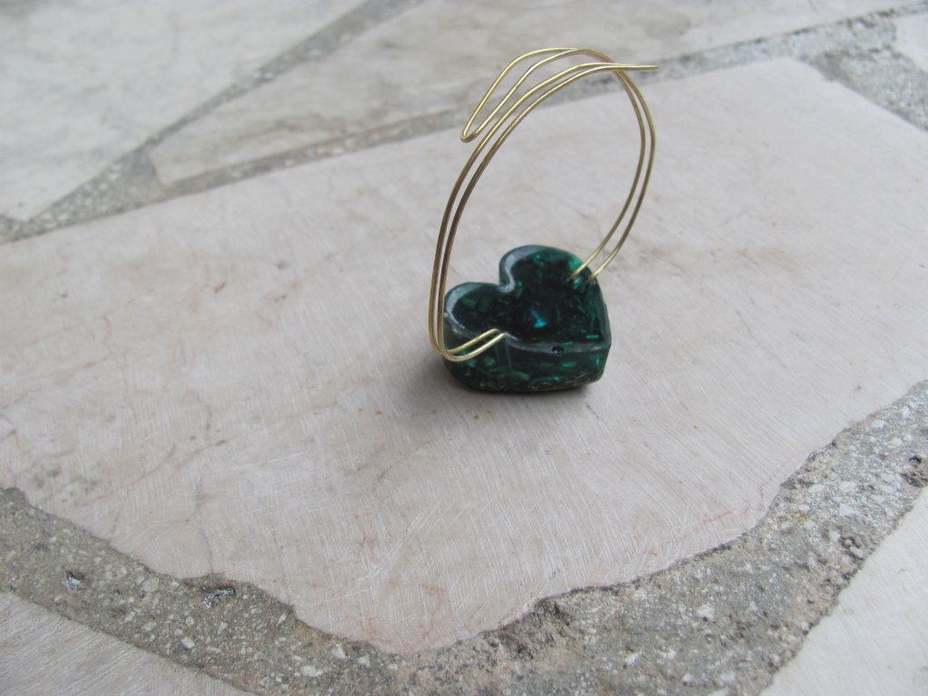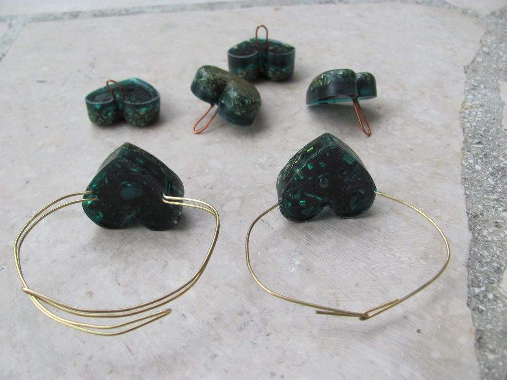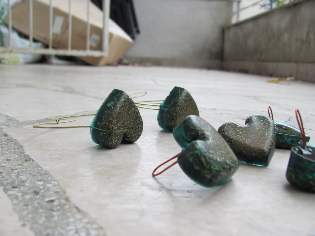Pa rekoh ajmo to probati, međutim, osim same žice od mesinga htio sam i mali orgonitič, odlučio sam se za malo srce. Koristio sam mesing piljevinu, malo gorskog kristala i samo jedan veći komad hematita. Pošto je orgonit blizu zapešća gdje je koža najtanja i gdje su krvne žile najbliže površini kože ideja je da se i cijela krv lagano orgonizira s ovim malim orgonitom. Nosim ga već par mjeseci, ne mogu reći da sam osjetio ikakvu značajnu promjenu, ali volim ga osjetiti na ruci. Napravio sam dvije vrste narukvice: s duplom i jednostrukom žicom, te još par privjesaka. Sve je od epoksida.