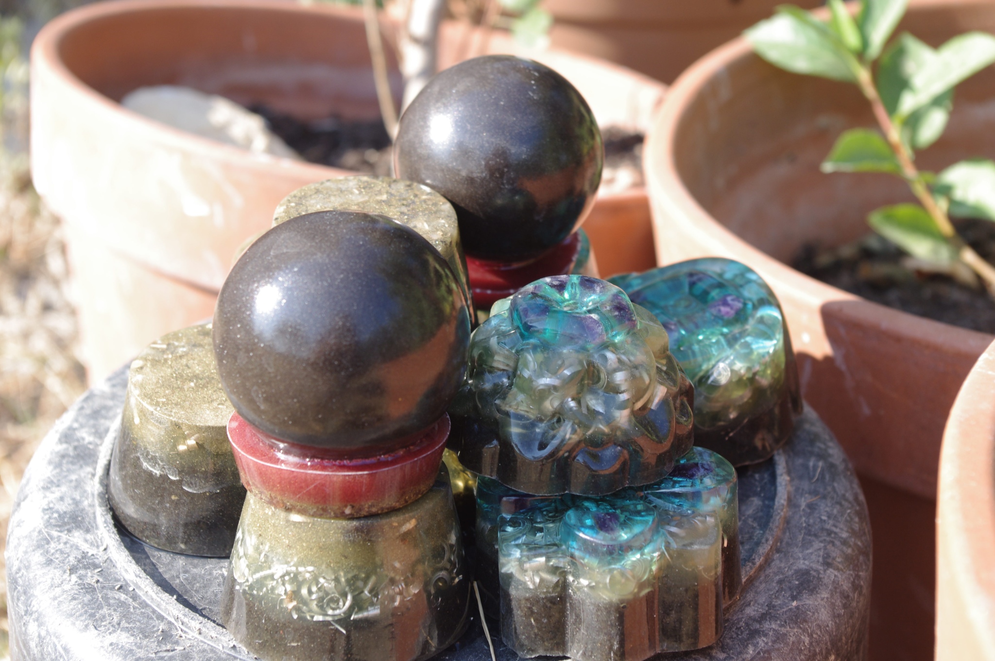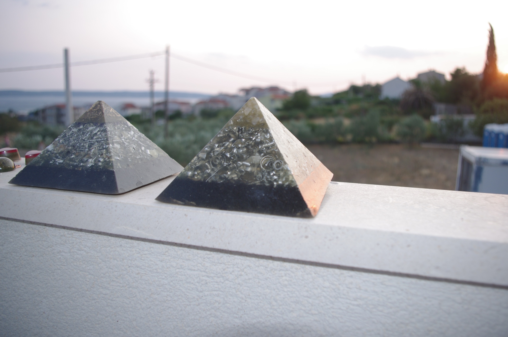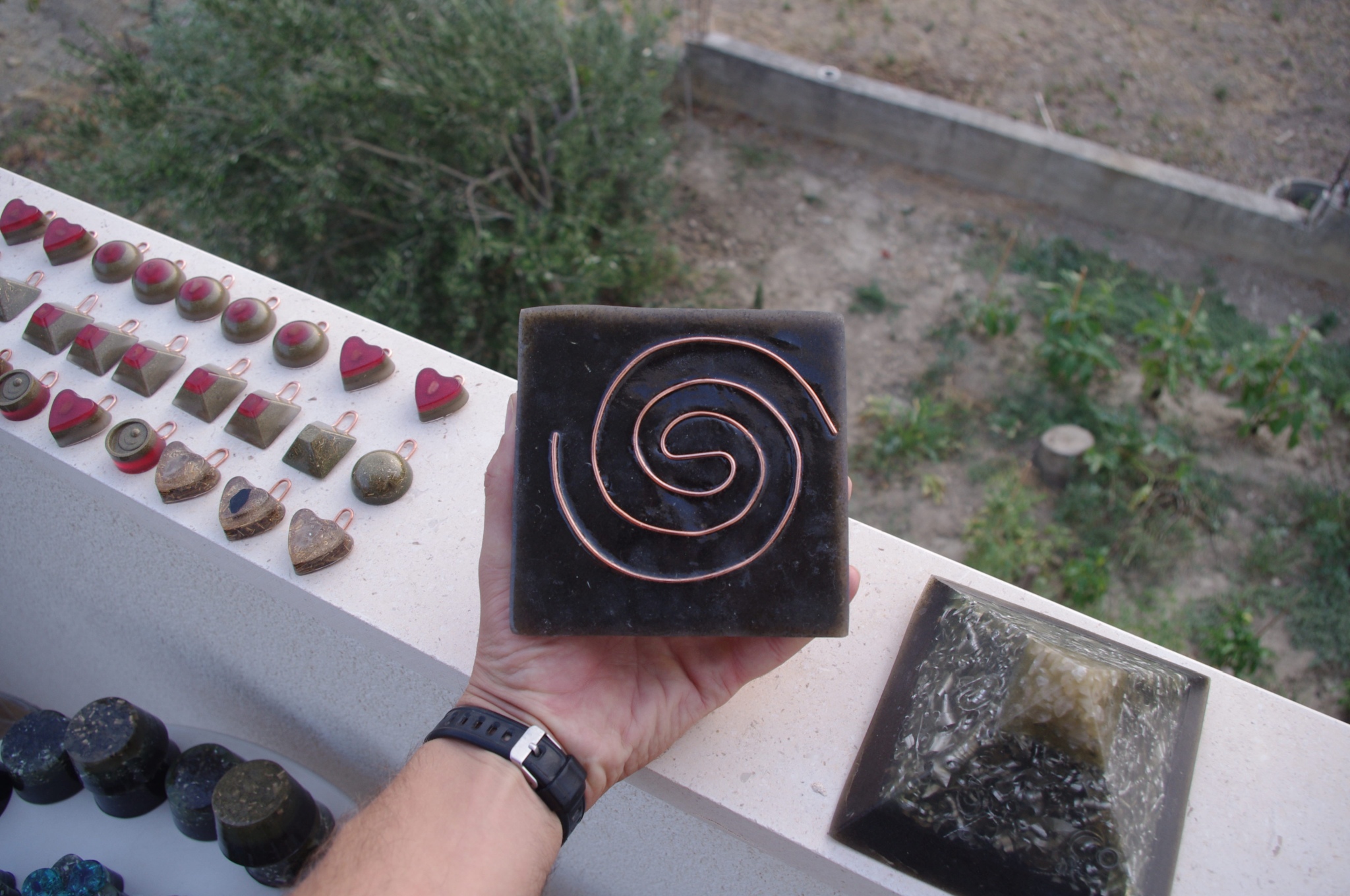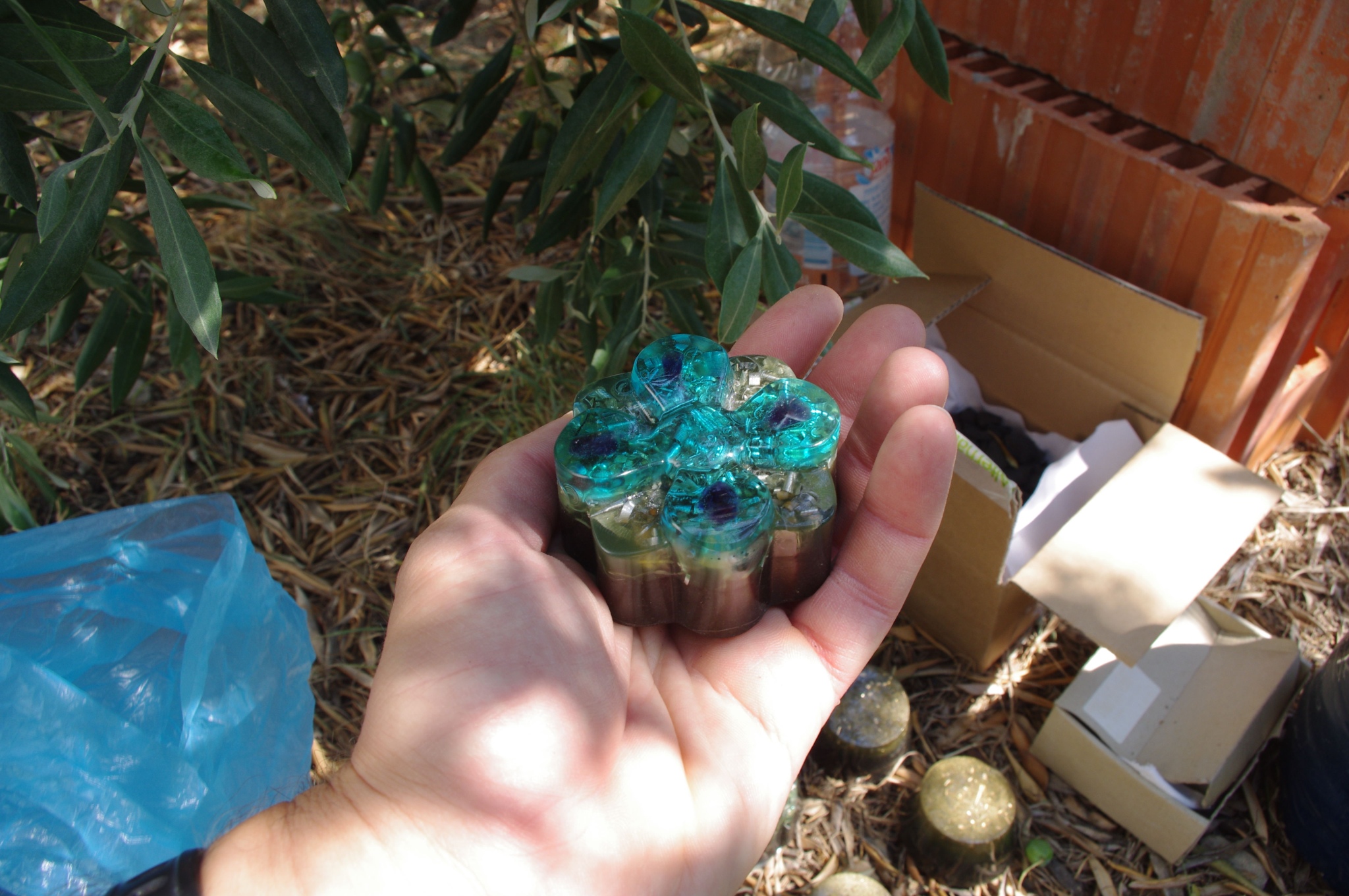 Tog ljeta 2017.g. sam očigledno 'namirisao' zov svojih orgonita jer sam se opet vratio ispod svojih maslina i počeo praviti orgonite, piramide, privjeske i ostale male dobre nositelje pozitivne intencije i vibracija. Izrada orgonita je poput odlaska na sveto mjesto, put k višem stanju svijestu, put otvaranja srčane čakre, bar je to moj osječaj. To i nije čudno kad se čovjek nađe okružen svim tim kristalima, poklonima Majke Zemlje, koje opet na neki vraćam njoj ukalupljene u orgonite i dobrim ljudima koji znaju prepoznati i cijeniti taj poklon.