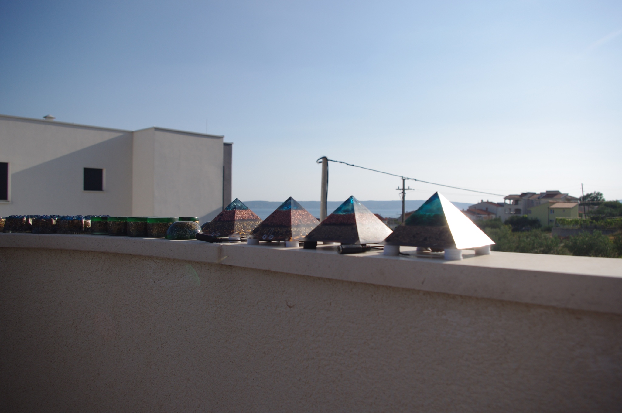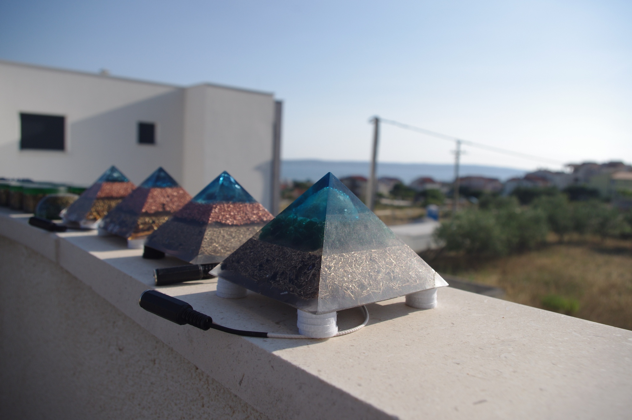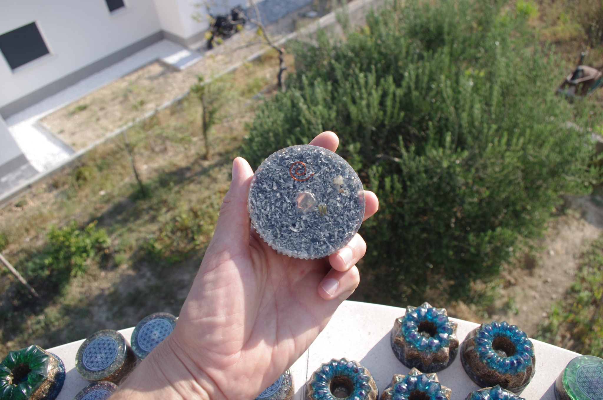 Nova serija orgonita je rađena s jasnom intencijom donošenja sklada u prostor i zaštite od EM zračenja. Šungit, turmalin i dimni kvarc su nositelji te ideje i nalaze se u svakoj piramidi i orgonitu. Ametist, gorski kvarc, ogromne kvarcne špice koje sam dobio na poklon od meni drage osobe, čiovski žuti kalcit, malo lavande, kamilice, lapis lazuli i garnet zajedno s finom vibracijom bakra i bronze čine magičnu kombinaciju koja ostvaruje namjeru kreatora, a to je energetska čistoća prostora i ljepota uhvaćena u trenutku vremena.